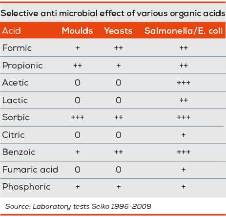 While adding organic acids can provide an anti-microbial effect to inhibit moulds in feeds, individual organic acids may not provoke consistent responses in various fungi. For example, testing found that formic acid is more effective against Salmonella and E. coli than against other organisms, while sorbic acid is equally effective against multiple fungus types.