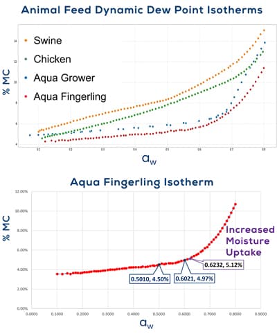 Calculating isotherms highlights the variability in moisture content and aw in different feeds. Specific isotherms can pinpoint the ideal level of moisture required to avoid quality loss, reduce microbial growth, and determine the point at which rapidly increased moisture uptake begins.