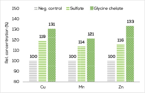 Several research studies have demonstrated that chelated forms of Zn, Mn, and Cu are characterized by a higher bioavailability compared to their respective inorganic forms. This supports trace mineral-related body functions more efficiently and enables a lower inclusion rate and hence excretion of metals. The higher bioavailability of chelates is related to a different mechanism of absorption and to better protection from dietary antagonisms.