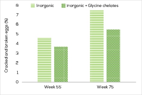 In a recent field trial with laying hens, a combination of glycine-bound Zn, Mn and Cu was included on top of a commercial diet. During the trial period, improved eggshell quality was demonstrated by a lower number of cracked or broken eggs (Figure 3). Also, a visual egg inspection by the farmer indicated that the eggs were shinier with a stronger eggshell.