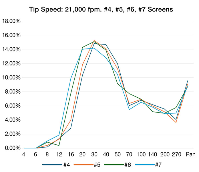 Higher tip speeds produce more fines, which leads to a higher standard deviation, but typically has a higher throughput by the use of larger screens. Lower tip speeds produce a more uniform grind, but sometimes come at a lower throughput.