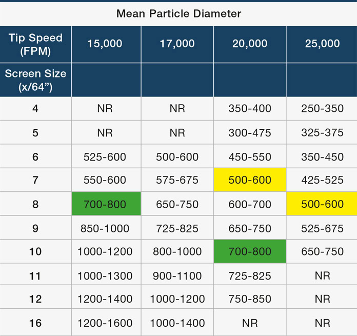 For a finer grind size, the screen can be effective in achieving the desired output. For coarser grinds, depending on screen size alone results in a larger standard deviation. Hammer pattern and tip speed are key variables that, in addition to screen size, help improve the process and achieve a more standard, quality product.