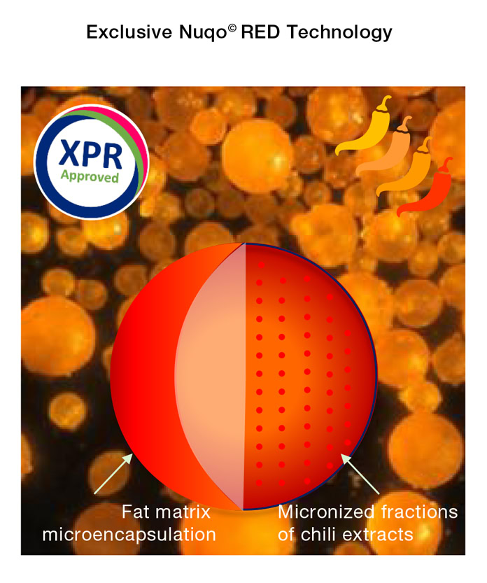 To overcome these challenges, Nuqo developed a proprietary microencapsulation technology that protects the hybrid capsaicinoids in a fat-based coating. Nuqo RED is developed and produced following Nuqo’s proprietary XPR (eXtra Protection & Release) approach, a technology platform designed to ensure that active compounds are protected during feed processing, and released in a timely, site-specific manner within the gastrointestinal tract. This technology enables Nuqo RED to deliver its effects at low inclusion rates, making it a highly efficient and targeted solution compared to conventional alternatives. This encapsulation also masks the irritant properties of capsaicin, making Nuqo RED safe and practical for use by feed manufacturers and farmers. Finally, it stabilizes the active molecules through feed processing and passage in the rumen, ensuring enhanced bypass properties.