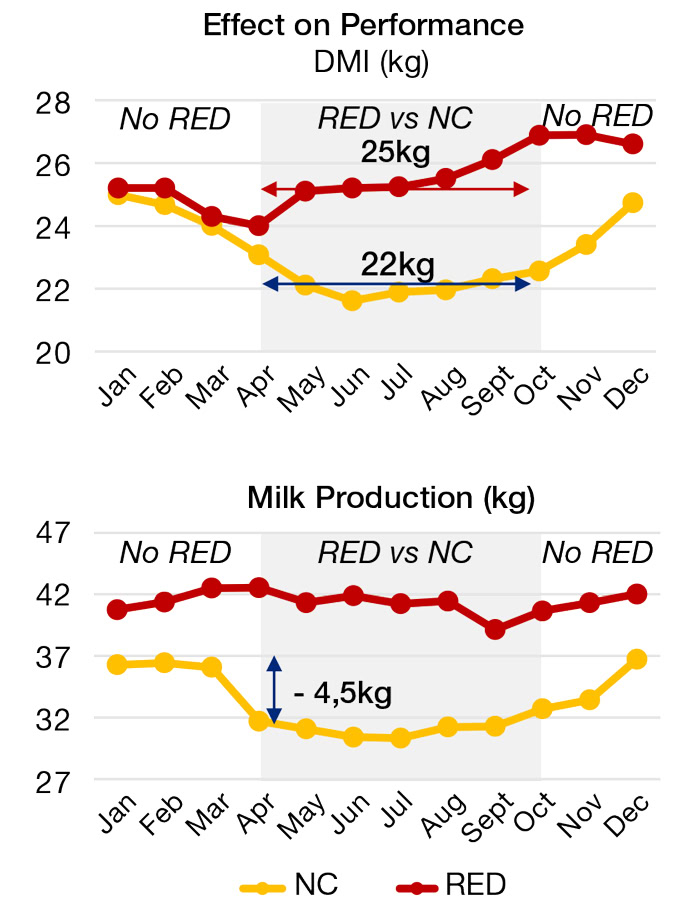 • Dry Matter Intake (DMI): While both groups started with similar DMI in winter (around 25 kg/day), DMI dropped significantly in the control group during the hot months, stabilizing near 22 kg/day. In contrast, cows supplemented with Nuqo RED maintained higher DMI levels, close to 25 kg/day, preserving nutrient intake during heat stress.