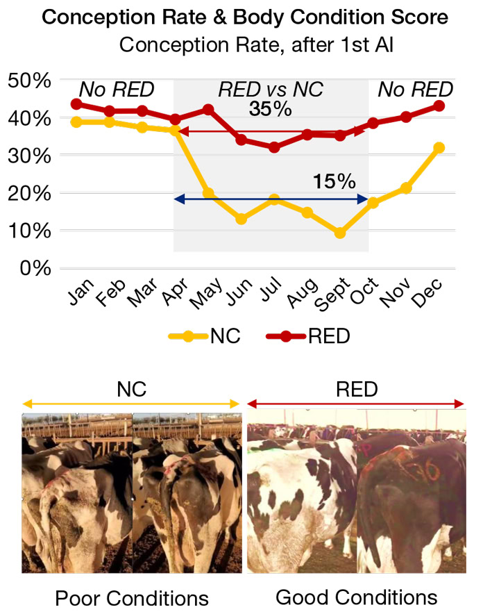 • Reproductive Performance: Fertility was also supported by Nuqo RED. While conception rates after the first artificial insemination fell to between 10-20% in the control barn during the hot season, the supplemented group maintained a conception rate near 35%. Better body condition scores in the Nuqo RED group further supported improved fertility outcomes.