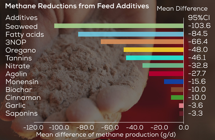 Product-based approaches have explored the use of several different feed additives including seaweed, 3NOP, nitrates, fatty acids, and other bioactive compounds.