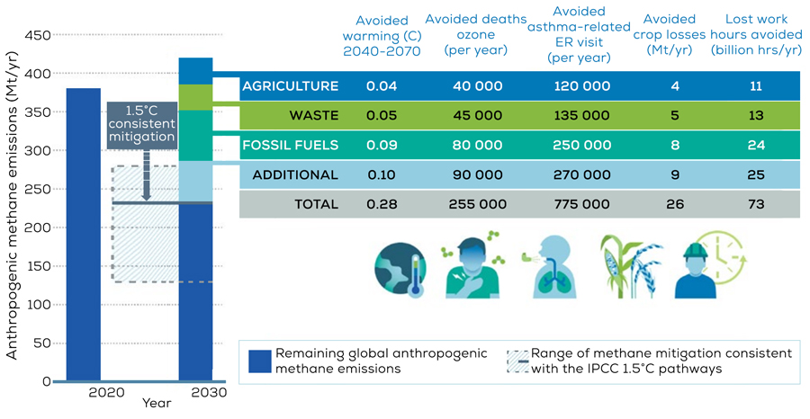 Carbon dioxide, methane and nitrous oxide are some of several gases known to trap heat in the atmosphere. Although carbon dioxide is a more prevalent GHG, methane has been found to be more damaging within its lifetime of about 12 years. As such, efforts to slow warming are focusing on reducing the amounts of methane released. Considering the potential benefit of these efforts, reducing total methane emissions by 30% from the levels generated in 2020 could curb warming by 0.2-0.3C in 20 years.