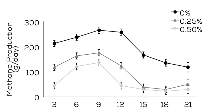 Researchers in Australia discovered that a type of seaweed reduced methane emissions in vitro.3 When added to cows’ diets it displayed similar properties and when fed to beef cattle at 0.25% or 0.5% for 5 months, emissions dropped and stayed low.4,5 A greater reduction is noticed when the diet has a higher concentrate level leading to an up to 80% reduction with high energy diets and 50-60% reduction for high forage diets.