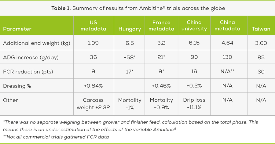 Factors like feed formulation, climate, housing, management, and genetics can cause performance variations in different regions. Even though the researchers were confident that the mode of action of Ambitine® is robust enough to show improvements regardless of all these variables, it was decided to gather more data under regional differences (i.e. Asian with a very specific high heat/moisture climate and Europe with its complex wheat-barley-soy based diets).