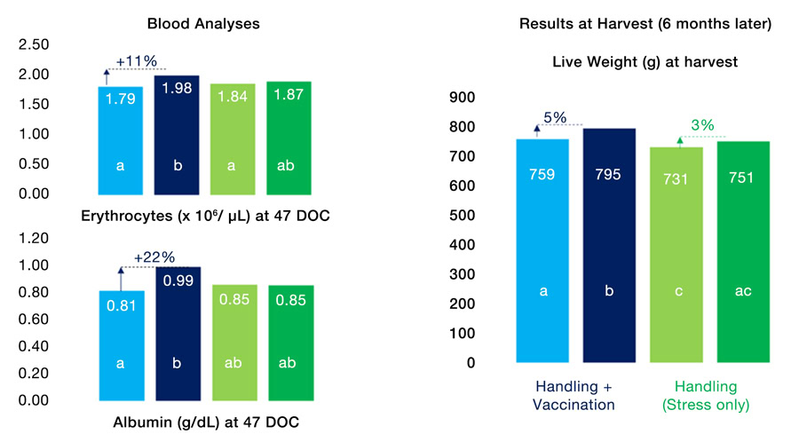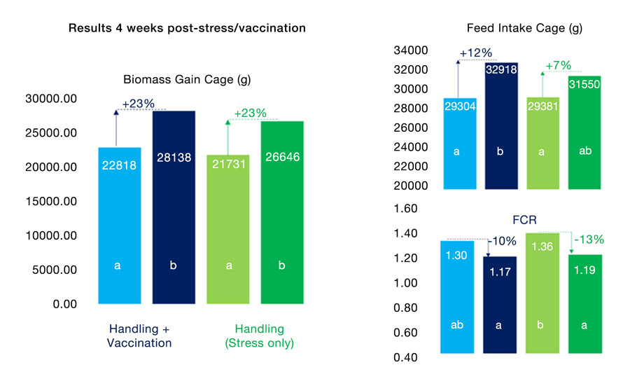 Results showed significant 23% increase in biomass and 13% improvement in feed conversion rate (FCR), as well as 11% erythrocytes and 22% albumin blood concentrations increased values compared to the control cages within one month after vaccination and/or handling stress. These results led to a significant 5% increase in body weight at harvest six months later, after only four weeks of distributing the specific feed during the juvenile stage of the tilapia.