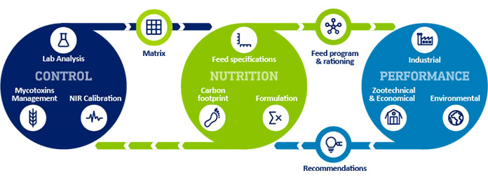• Control: Ensuring the management of inputs and outputs through appropriate feedstuff sourcing and extensive physical analytical services, as well as providing tools and knowledge for effective quality control of raw materials and finished feeds. Supported by technology and digital apps for informed decision-making.