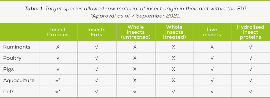 In the European Union (EU), products used as protein sources in animal feeds generally qualify as feed materials, which are defined as “products of vegetable or animal origin, whose principal purpose is to meet animals’ nutritional needs, in their natural state, fresh or preserved, and products derived from the industrial processing thereof, and organic or inorganic substances, whether or not containing feed additives, which are intended for use in oral animal-feeding either directly as such, or after processing, or in the preparation of compound feed, or as carrier of premixtures”. Key regulations on feed materials are Regulation (EC) No 767/20091 (“the Feed regulation”) and Regulation (EU) No 68/20132 (the Community Catalogue of feed materials, “the Catalogue”). The Feed regulation lays down rules for the placing on the market and use of feed, including feed materials such as alternative proteins. It also establishes the creation of the Catalogue, a positive and non-exhaustive list of feed materials and manufacturing processes that can be used for feed materials. As EU feed materials, alternative proteins can be marketed and used if they are safe, and they do not have a direct adverse effect on the environment or animal welfare. Products not listed or not covered by entries of the Community Catalogue must be notified in the EU Online Register of Feed Materials before they are marketed3. Some alternative proteins may require a pre-market safety evaluation by EFSA (the European Food Safety Authority) depending on their production process, characteristics and/or composition. In addition, further regulations must be considered for certain products. For example, alternative proteins that are derived from genetically modified organisms (GMOs) must also comply with EU regulations on GMOs, including labelling requirements. Processed proteins derived from insects may only be obtained from insect species specified in Regulation (EU) 142/20114 and cannot be used in feeds for ruminant species due to EU “feed ban rules”. Overall, the regulatory framework in the EU aims to ensure that alternative proteins used in animal feeds are safe and of high quality, while also supporting the development of new and innovative sources of protein for sustainable animal nutrition. Table 1 below gives a brief overview of the approved use of insects as alternative protein sources in the EU.