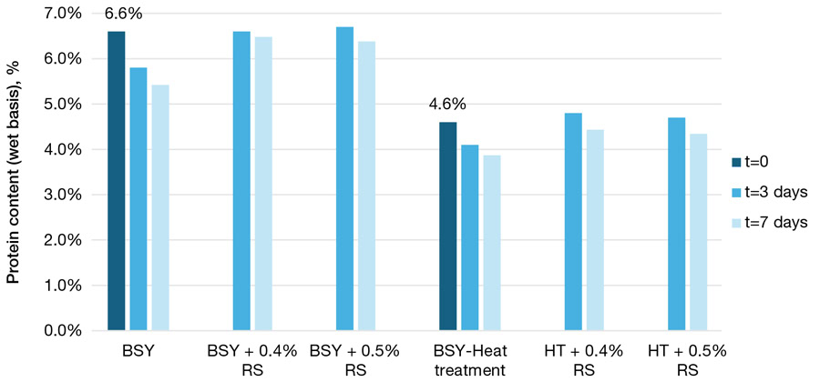 Live yeast cells that are used for alcohol production have a thick cell wall, so physical, mechanical, or enzymatic disruption is often required to break the cells and release proteins. These steps may include heating, centrifuging or treatment with specialised enzymes, but some extraction methods are more expensive than others. The industry’s preferred method is direct steam application or heating live yeast to 80°C, which can produce protein degradation. Selko Revalet offers a cheaper solution for yeast inactivation and protein preservation and avoids damaging heat treatments and additional energy consumption. In a research trial comparing the protein content found in brewery spent yeast that was untreated, heat treated or treated with a blend of organic acids, the acidified content maintained 6.48% protein content – almost the initial 6.6% content – for 7 days, while the heat-treated product fell to 3.8% during that period (Figure 1). However, Selko Revalet not only inactivates live yeast cells, once the cell is destroyed, proteins are released in yeast extract and will remain in the same concentration. Additionally, adding the organic acid blend prevents microbial proliferation during transportation and storage of the yeast extract.