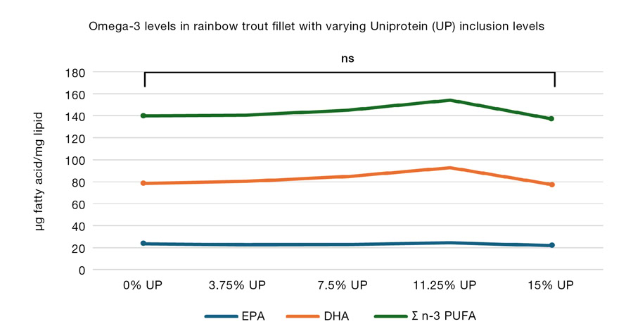 Another interesting point is that many of these ingredients tend to lower the omega-3 content in fish fillets. However, freshwater fish have a limited capacity to produce long-chain omega-3 fatty acids themselves, so feeding them well-studied, balanced diets can help compensate for this reduction. For example, a study by Ruiz et al. (2023) found that replacing 100% fishmeal with Uniprotein® (15% inclusion) did not disrupt the long-chain omega-3 polyunsaturated fatty acid profile of rainbow trout fillet. Despite complete fishmeal replacement, no significant differences were observed in fillet levels of eicosapentaenoic acid (EPA), docosahexaenoic acid (DHA), or total long-chain omega-3 polyunsaturated fatty acids (Σ n-3 PUFA). This demonstrates that well-formulated diets can maintain essential fatty acid profiles in freshwater fish (Figure 2).