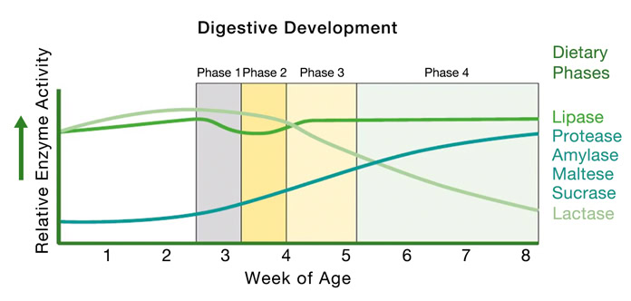 In addition, the digestive enzyme capacity of piglets is still developing during early life and is often insufficient at the time of weaning (as illustrated in Figure 2), meaning that piglets are not well equipped to digest a plant-based, carbohydrate-rich diet.