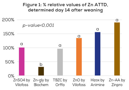 A recent study done by SEGES (leading innovation center in Denmark) and published by Nielsen et al, in 2022, revealed the apparent total tract digestibility (ATTD) of 6 different zinc sources supplemented during the first 14 days after weaning at 100ppm Zn (figure 1). Potentiated zinc (HiZox®) displayed a numerically improved bioavailability among sources compared to other inorganic sources and even an organic source such as Zinc Glycinate. This may be due to its unique physico-chemical properties that makes its dissolution optimal, steady rate to provide a continuous diffusion of ionic zinc without binding to antagonists.