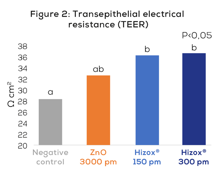 A study published with Ghent university revealed that nutritional dose of potentiated zinc (HiZox®) performs at least as good as pharmacological ZnO on gut integrity (see figure 2). TEER is a marker of gut integrity: the permeability of the mucosa decreases when TEER increases.