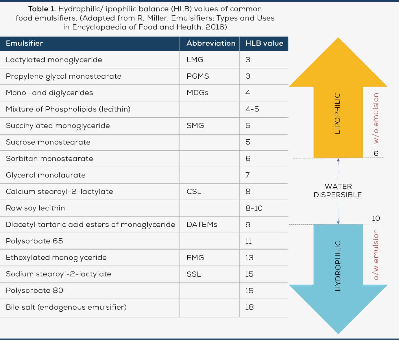 The HLB value of lipophilic emulsifier is lower than that of hydrophilic emulsifier. The intestinal track is an aqueous environment, where hydrophilic emulsifier would have a stronger emulsification effect and a higher HLB value represents better emulsification effects on oil. The HLB value of bile acids is about 18, which has excellent emulsification capabilities compared to other emulsifiers (Table 1).