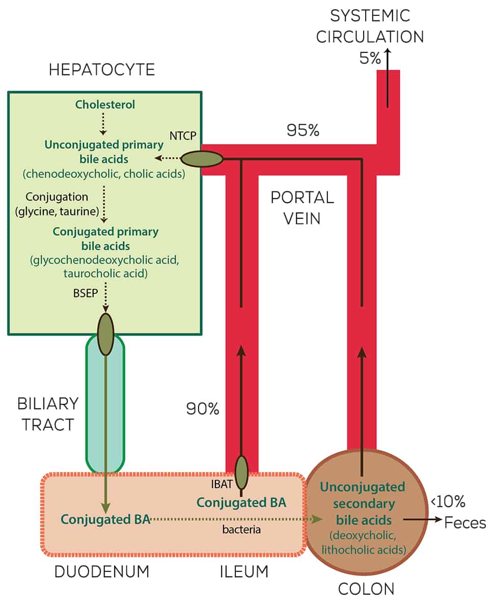 The body produces a natural emulsifier – bile acids. These are synthesized from cholesterol in the liver, and secreted into bile duct, and into the small intestines where they play a part in facilitating the absorption of dietary lipids and fat-soluble vitamins. Most bile acids are reabsorbed in the terminal ileum and returned to the liver via the portal vein. The bile acids are up taken by the hepatocytes and subsequently transported into bile which completes their enterohepatic circulation (Figure 1).