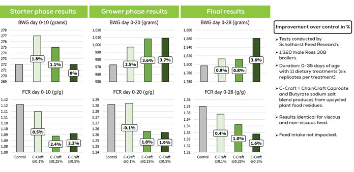 A blend of the sodium salts of Caproic acid and Butyric acid has been tested for health and productivity improvement of monogastrics. The tests conducted at Schothorst Feed Research proved the value of adding this blend to the diet of young broilers. Although the animals were kept under optimal conditions, and not challenged, the Caproic and Butyric sodium salts blend still provided additional body weight gain (BWG) of up to 3.7% and up to 2.4% feed conversion ratio (FCR) improvement compared to the control feed, see graph 1.