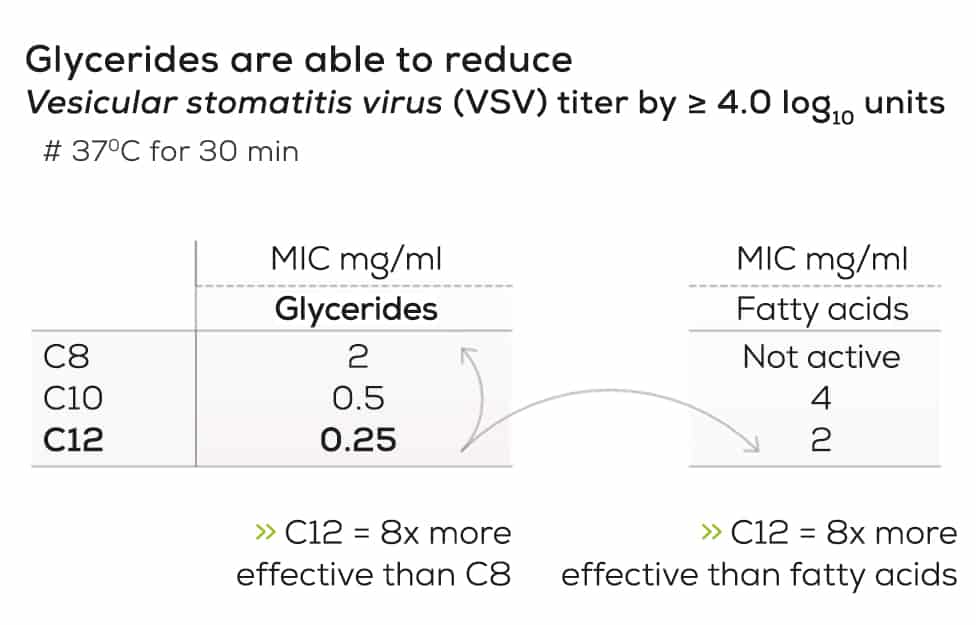 When it comes to antiviral effects, lauric acid and its glycerides always stand out. In vitro work by Thormar et al. 1987 already showed that lauric acid is active against the enveloped Vesicular stomatitis virus (VSV), see Figure 1. However, monolaurin proved to be active as well, but at a concentration which was 8 times lower compared to lauric acid, confirming its stronger antiviral activity compared to free lauric acid. An interesting review on lauric acid and lauric acid glycerides by Lieberman et al. 2006 also pointed out the unique antiviral properties of specifically the glycerides which wturn out to be more biological active compared to free lauric acid alone.
