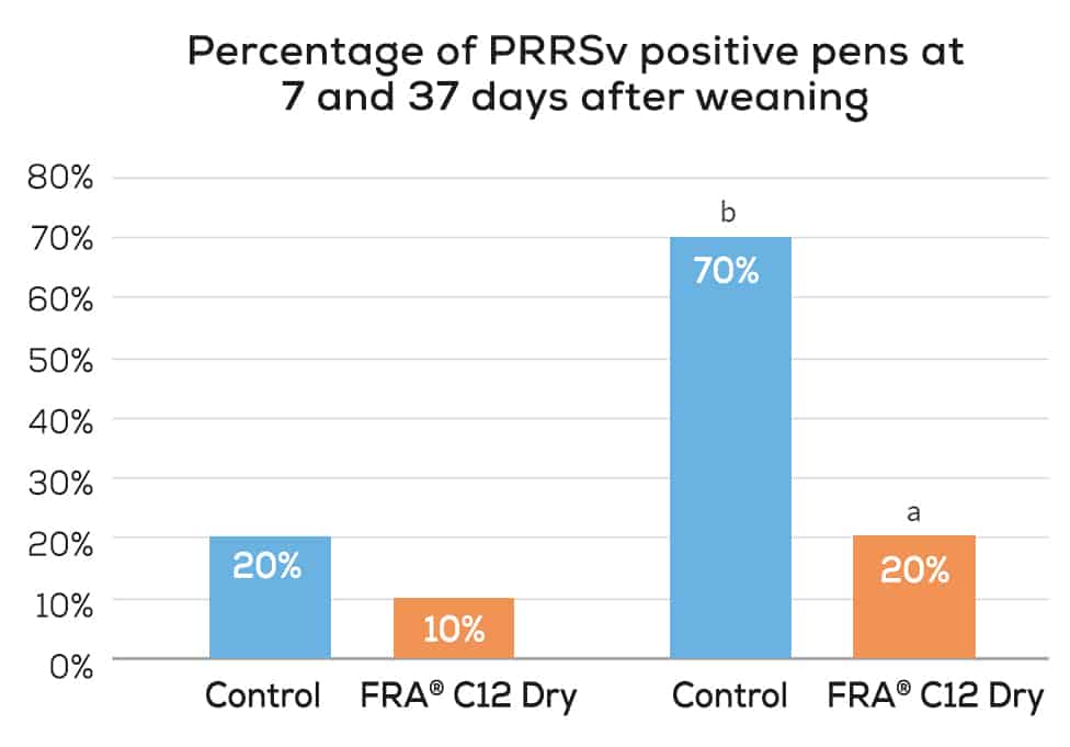 Although the exact mode of action is currently not yet fully understood, FRA® C12 seems to be an interesting and promising tool assisting in the viral clearance of PRRSv and in controlling the risk for secondary infections in PRRSv-positive pigs.