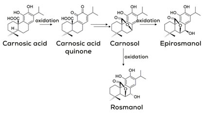 To prevent oxidation rosemary extract, or specifically, carnosic acid can scavenge singlet oxygen, an excited form of oxygen, and free radicals. While doing this carnosic acid will oxidize itself to form a carnosic acid quinone that by action of temperature or other catalysts will be transformed into carnosol. The carnosol molecule will further follow this path and will oxidise itself to be transformed into epirosmanol or rosmanol, depending on the stereochemistry of the reaction.2,3 See Figure 1.