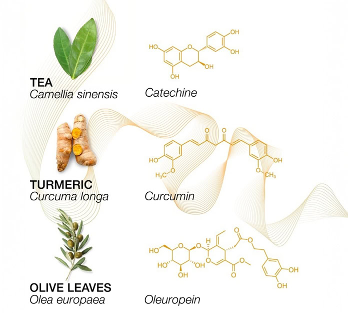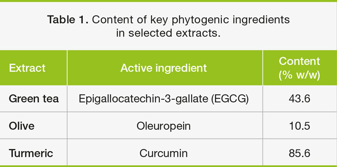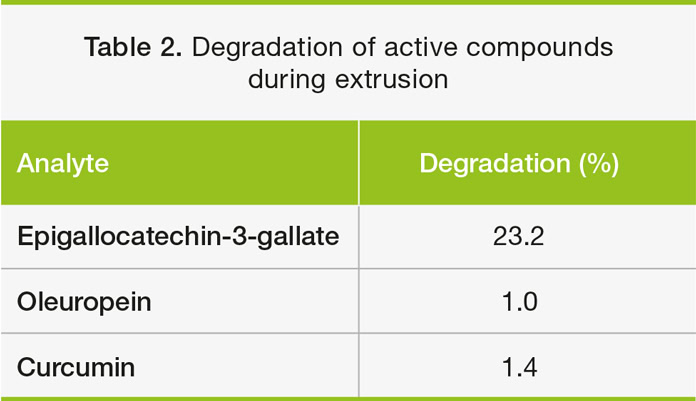 In an in-house study, three botanicals shown in Figure 1 were evaluated for the stability of their key bioactives under different stress conditions. A blend of their extracts (1% turmeric, 1.5% green tea, 1.5% olive leaves) was incorporated into a simplified feed matrix composed of pea protein (14%), waxy corn starch (16.5%), fibers (1.5%), rapeseed oil (7.5%), and water (56.5%). The bioactive markers in Table 1 were selected to investigate degradation.