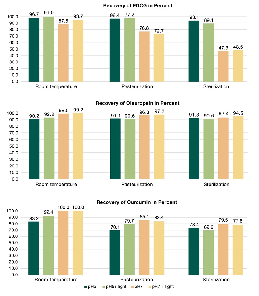 • pH had a complex effect. At room temperature, most compounds were more stable at pH 7 – except EGCG. Under thermal stress, EGCG, and oleuropein showed higher stability at pH 5, whereas curcumin remained consistently more stable at pH 7.