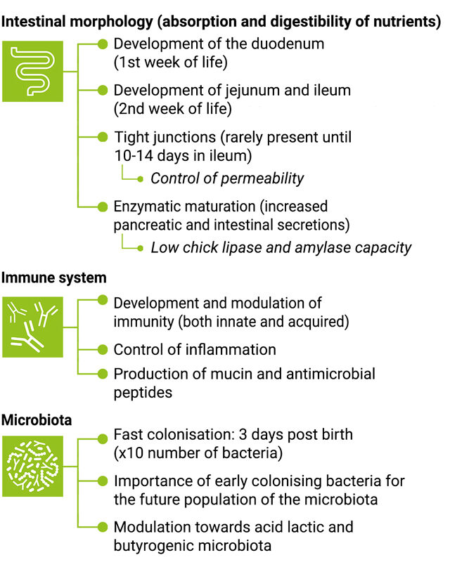 In the case of the chick, both actions are especially relevant since, as we have mentioned, this increased consumption will have a great impact on the development of the intestine, increasing the length of the villi, stimulating enzymatic maturation and, more significantly, enhancing the absorption of nutrients and their digestibility.