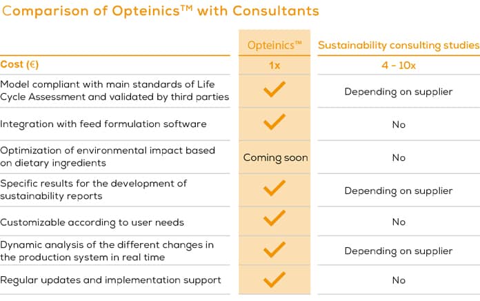 With a simple interface, any nutritionist can understand the environmental impact of the feeds they design and adapt their formulations to minimize impact, easily achieving double-digit percentage reductions in total environmental impact, in many cases without an increase in feed cost. In essence, Opteinics™ democratizes access to sustainability knowledge.