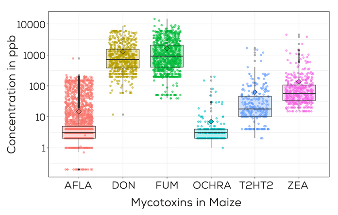 Mycotoxin contamination levels in corn ranged from 29% to 49% (Table 1). The highest contamination for corn was seen with Fumonisins (57%) followed by ZEA (52%) and AF/DON (49%), while ochratoxin was found least often – in 29% of samples. Toxins with the highest mean concentrations included DON and fumonisins, which averaged 1271ppb and 1629ppb, respectively. However, the median concentration for both contaminants was much lower – 700ppb and 902ppb, respectively – suggesting that some outlier samples with high concentrations could be skewing the analysis. It is recommended, therefore, to present both mean and median values for mycotoxin concentrations. A detailed pictorial mycotoxin distribution can be seen in Figure 1 in the form of a box plot and a jitter. Within the box, the diamond shape represents mean while the centre line of box represents median. The closer the diamond is to the centre line, the more uniform the data.