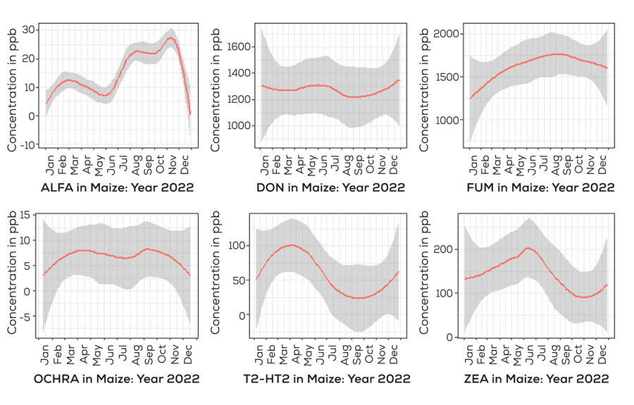 Mycotoxin concentrations in corn change throughout the year depending on the growing conditions in the field as well as storage conditions. As can be seen in the Figure 2, AF concentrations showed three peaks in the year in the months of February, July, and October. Each one of the mycotoxins showed different peaks indicating the differences in the conditions required for their production. The sizeable quantity of corn produced in 2022 will be used at least until Q1 of 2023 and hence studying such month-to-month variations can provide some tips for effective mycotoxin risk management.