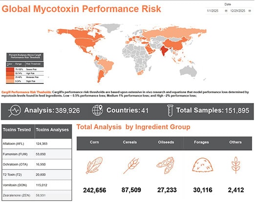 Cargill Micronutrition & Health Solutions has announced the publication of its 2025 Global Mycotoxin Report, one of the most comprehensive analyses of mycotoxin contamination in animal feed ingredients around the world. The 2025 report is based on 389,926 analyses conducted across 41 countries. The findings confirm that mycotoxin pressure remains a persistent and performance-limiting challenge for producers globally. Seventy-one percent of samples tested positive for at least one mycotoxin above the detection limit. Thirty-four percent exceeded Cargill’s performance-based risk thresholds, levels associated with measurable impacts on animal productivity. Deoxynivalenol (DON) remains the most prevalent and highest global performance risk, with 53 percent of analyses above performance thresholds. Fumonisins (FUM) increased in risk compared to the previous year. Zearalenone (ZEN) remains consistently high across multiple regions. Multi-mycotoxin contamination continues to be a defining feature of global feed risk. Forty-seven percent of samples tested contained three or more contaminants, reinforcing the need for comprehensive risk management strategies.