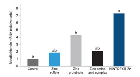 The bioavailability of a mineral is generally defined as a proportion of the total mineral in feed that is utilized for normal body functions. It has been traditionally estimated as the mineral retention in the animal tissues (Underwood and Suttle, 1999). More recently, the use of biomarkers has allowed to know the bioavailability of a mineral in a more precise way. An example is that of the metallothionein protein, whose expression in the intestinal mucosa is regulated by the amount of mineral (mainly Zn and Cu) absorbed. Figure 3 shows the result of an experiment that compared the bioavailability of various Zn sources by measuring metallothionein mRNA expression in the intestine of broilers (Richards et al., 2007; 2008). The birds were fed a control diet or diets supplemented with 70 ppm of Zn from different sources. The results showed a higher metallothionein mRNA expression in animals supplemented with MINTREX®Zn, indicating that it was the source that provided the highest bioavailability.