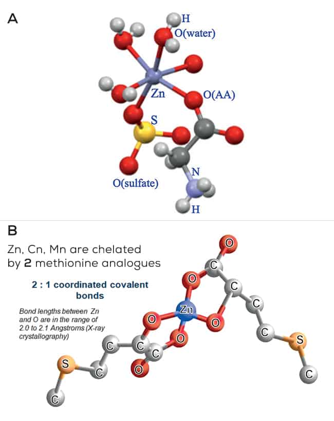 Coordinated covalent bonds can produce chelates (chele = clamps), if the arrangement of donor atoms around the mineral forms a chelation ring (Figure 1). From the chemical point of view, there are four main classes of “organic” minerals marketed in feed animal industry: (a) mineral complexes with AA or peptides derived from protein lysates, called proteinates; (b) mineral complexes of a single AA such as glycine (Gly) with a well-defined formula (eg, Zn(HGly)SO4), called improperly glycinates or “mono-chelates”; (c) minerals chelated with a single AA, with well-defined formula (eg Zn(Gly)2), known as AA bis-chelates; and (d) minerals chelated with hydroxy analogue of methionine (HMTBa) of well-defined formula (eg, Zn(HMTBa)2, which are bis-chelates of HMTBa (MINTREX®, Novus International, Inc. ).