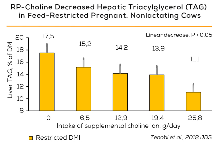 A major functionality of choline is as a precursor for phosphatidylcholine which in turn is a key structural component of VLDL. The rate of VLDL export (and therefore fat export from the liver) depends on the rate of phosphatidylcholine synthesis (Cole et al. 2011). The classic symptom of choline deficiency in many species is fatty liver. It is not surprising then that supplementation of rumen protected choline to cows can help alleviate the degree of fat accumulation in the liver (Cooke et al., 2007; Zom et al., 2011; Zenobi et al., 2018a). Figure 1 shows the results of supplementation of rumen protected choline (ReaShure) at graded levels on liver fat accumulation in restricted fed dry cows (Zenobi et al., 2018a). As choline ion increased liver fat accumulation decreased linearly.