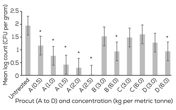 Feed sanitation requires using bactericidal compounds at low inclusion rates to control microbial contamination and offer long-lasting protection against feed recontamination. Feed sanitizers have been repeatedly shown to effectively reduce Salmonella contamination in feed. For example, a study performed by the Animal Plant and Health Agency (APHA) determined that a formaldehyde-free feed sanitizer controlled Salmonella in feed at 1 kg/MT.