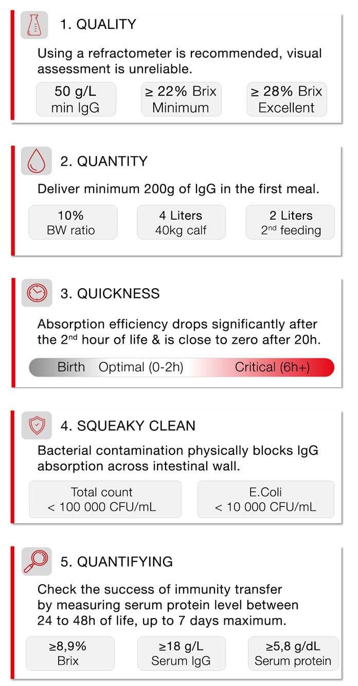 Optimal colostrum management follows a precise methodology summarized by the “5Q’s” rule. Each of these parameters has to be strictly monitored to ensure the survival and development of the newborn calf. Each “Q” is defined by specific scientific thresholds that must be met.