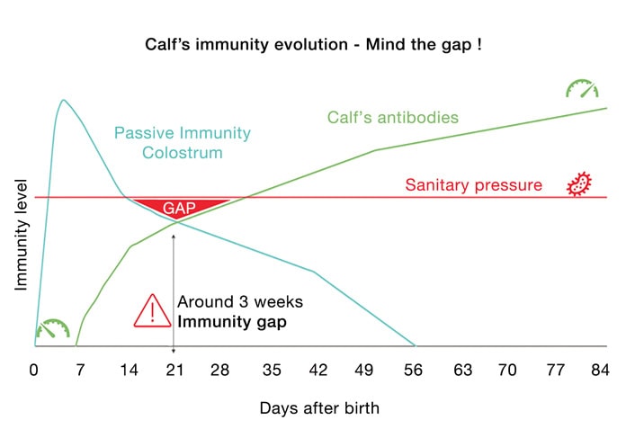 Unlike many species, cattle’s placenta is impermeable to large proteins, including immunoglobulins. Consequently, calves are born without immune defences and no circulating antibodies to protect them from environmental pathogens. They depend entirely on the passive immunity transferred via colostrum to survive environmental challenges in the first weeks of life until their own immune system becomes entirely functional at approximately 3 to 4 weeks of age.