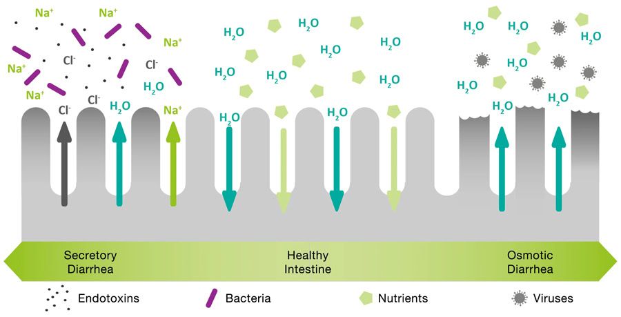 There are two main strategies for treating diarrhea. One is the compensation of existing fluid loss with products containing electrolytes like Prolyt Pack® Extra. The second is the reduction of fluid loss itself by using water-attracting products. This strategy works to decrease fluid loss, retaining it in the body.