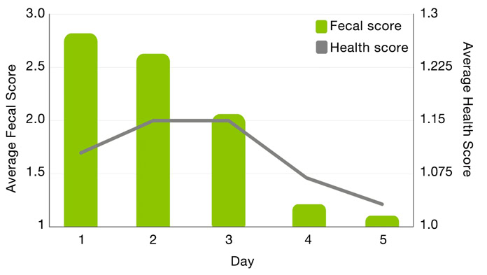In the trial, 81% of calves had normal fecal consistency (Grade 1) on day 3 after supplementation with DiaReset, and 91% of calves had normal stool consistency after 4 days, with a corresponding improvement in health score (Figure 4).