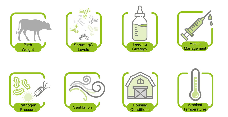 The health of young calves has a significant impact on their entire lifespan, affecting growth rates, reproductive efficiency and even future milk production. In fact, calves are more susceptible to mortality during the first three weeks of life than during the rest of their rearing period, which makes this period extremely economically important. Numerous factors, including animal, environmental and management practices, contribute to calf health and disease (Figure 1).
