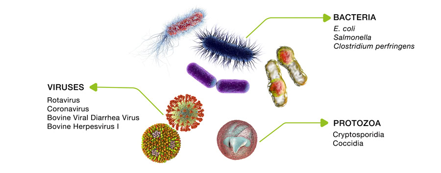 There are numerous infectious and non-infectious agents associated with calf diarrhea—it is not a single disease. Infectious causes include bacteria such as E. coli, Salmonella, and Clostridium perfringens; viruses such as rotavirus and coronavirus; and protozoa such as cryptosporidia and coccidia (Figure 2).