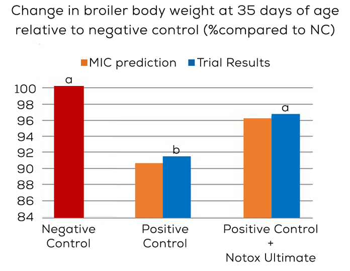 In many cases despite the absence of visible symptoms, mycotoxins may significantly impact animal health and performance. Recognizing the imperative need for proactive measures, Cargill has developed tools and solutions to empower poultry producers in the battle against mycotoxins. Our in-house analyses and comprehensive mycotoxin database enable us to assess contamination levels, providing a critical foundation for informed decision-making. Understanding the nuanced impact of mycotoxin contaminations on animal performance and health is paramount. To address this, Cargill analysed over 110 scientific articles to develop the Mycotoxin Impact Calculator (MIC). Compiling this extensive data, we formulated equations that predict performance losses by mycotoxin and poultry subspecies. The MIC, a science-based tool, assigns a precise figure to a previously vaguely defined problem, enabling informed decision-making and precise solutions to limit performance losses due to mycotoxins. In a recent broiler trial, our MIC predicted a 9.5% performance loss when 20 mg/kg Deoxynivalenol contaminated the feed. The calculator predicted that the drop in performance would be reduced to just 4% when Notox™ Ultimate, a large spectrum anti-mycotoxin additive, was used. The trial confirmed these predictions, as broilers fed Deoxynivalenol-contaminated feed lost 8.8% performance, and the addition of Notox Ultimate supported a reduction in loss to 3.4% (Graphic 1). This translates to a 1:4 return on investment, showcasing the effectiveness and accuracy of our calculator along with Notox Ultimate in minimizing mycotoxin-induced performance losses.