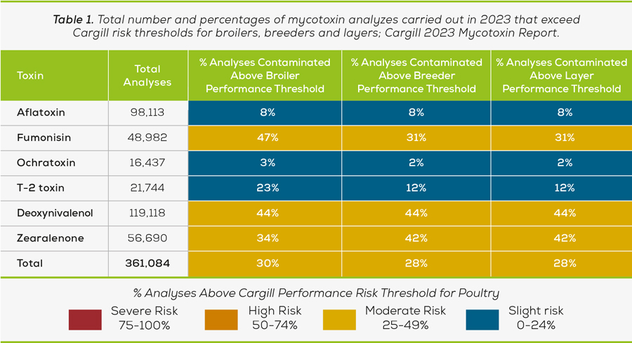 This extensive database is a powerful tool that enables us to accurately monitor mycotoxin distribution and contamination levels worldwide. This helps us to understand and address the unique challenges our customers face in different regions. In 2023, mycotoxin levels were noteworthy for all poultry segments: Fumonisin, Deoxynivalenol, and Zearalenone pose risk concerns (Table 1). For broilers 47%, 44%, and 34% of analysis respectively exceeded Cargill performance risk thresholds*. For breeders and layers, Zearalenone poses an even greater risk, with 42% of analyses exceeding our performance risk thresholds. Compared to 2022, we observed a decrease in T-2 toxin and Zearalenone contamination, while Deoxynivalenol levels have remained stable. However, the risk of Fumonisin has significantly increased. This highlights the substantial year-on-year variability in contamination levels, emphasizing the imperative need for a dynamic control plan. Cargill’s global mycotoxin analysis database serves as an indispensable tool in navigating this variability, enabling producers to implement effective control measures tailored to their specific challenges. Grains remain major contributors to mycotoxin contamination. Yet, plant protein sources like oilcakes frequently harbour noteworthy concentrations of Zearalenone.