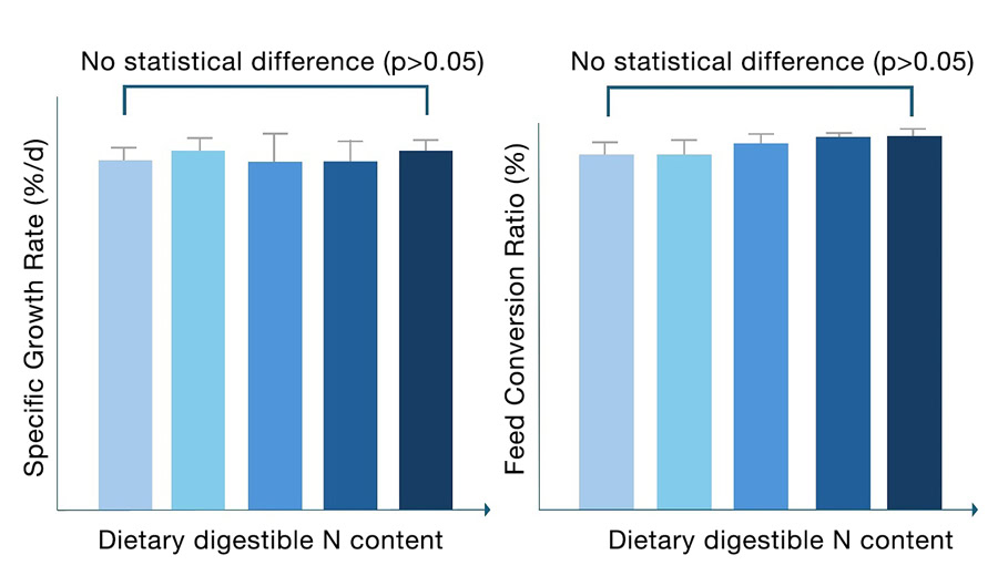 AmiNova is a concept whereby supply of nitrogenous compounds is optimised, reducing the artificial inflation of non-essential N, thereby reducing the excretion and eventual release to the environment of excess N. In developing this concept, Skretting AI Principal Researcher Ramón Fontanillas investigated the interactive effect of varying supply of total digestible N and the supply of amino acids at optimal inclusions, derived from numerous internal Skretting trials over the past 30 years, on Atlantic salmon and rainbow trout (Oncorhynchus mykiss) performance at varying fish size. Adequate supply of the essential amino acids (EAAs, those which cannot be synthesised by the animal) is most often the primary consideration when balancing N in aquatic feed formulations (with some exceptions for non-essential amino acids – NEAAs – with important non-protein functions). NEAAs may, however, become important when EAA supply is limited. When formulating to both protein and amino acid targets, it is assumed that supply of NEAAs, which are also required in a certain ratio for optimal protein deposition, is sufficient. At the same time, many EAAs are artificially boosted above requirement in this situation, allowing excess EAAs to be used for limiting NEAA synthesis, where required. Where this inflation of amino acid levels is not present, such as when formulating with lower or no total N targets, however, utilisation of EAAs could conceivably be influenced by the NEAA content of the diet. As such, the interaction between amino N source and the response to varying total N supply was also investigated in the concept development stage.