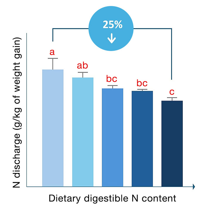 It is well documented that animals have a requirement for individual amino acids, and not for protein as a whole. In addition, determination of protein requirements is highly dependent on the use of a balanced digestible amino acid profile and is thus easily confounded by raw material choice and variation inherent with formulation to varying total or digestible protein in dose response studies. As a result, estimates of protein requirements may be prone to overestimation where protein content is inflated by specific amino acids being provided in excess in order for minimum requirements of limiting amino acids to be met with available raw materials. In addition, the “protein” content of diets and raw materials, and any requirement estimates based on these analysed contents, are in reality measurements of the nitrogen (N) content (multiplied by varying conversion factors). A certain proportion of this N comes from N-containing compounds not directly used for protein deposition (“non-protein N”, which can constitute up to 20% of total N). This N can be in the form of nucleic acids (not directly used for growth or health maintenance when coming from an exogenous source) or phospholipids and non-proteinaceous amino acids (which are required in varying quantities at different stages of the animal’s lifecycle). By establishing requirements for all individual N-containing compounds, rather than protein as a whole, it is possible to safely reduce oversupply of unnecessary N in feed formulations.