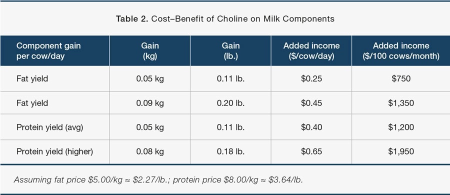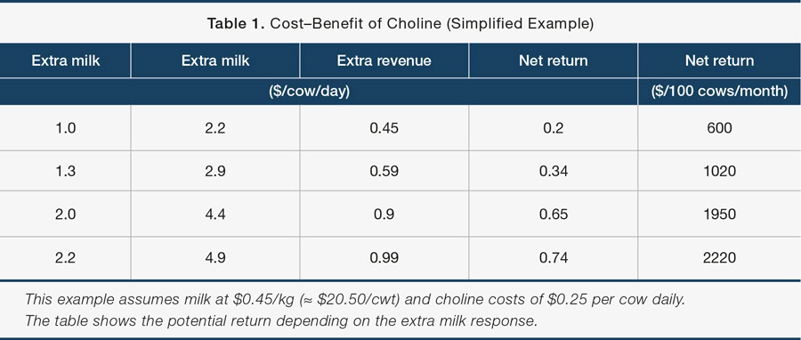 The best results were seen at about 13–14 g per day, where cows ate almost half a kilo (1 pound) more feed dry matter and gave about 1.3 kilos (2.9 pounds) more milk per day. At slightly higher levels, 15–21 grams per day, cows produced over 2 kilos (4.4 pounds) more fat-corrected milk, with direct improvements in the milk check. Importantly, feeding choline before calving alone did not change intake, it is the consistent feeding through early lactation that pays off. For example, if choline costs about $0.25 per cow per day and the extra milk brings in $0.60 to $0.80, the net return is $0.35–0.55 per cow per day. Across 100 fresh cows, this adds up to an additional $1,000–1,500 in profit monthly, making it a cost-effective tool in transition cow programs (Table 1).
