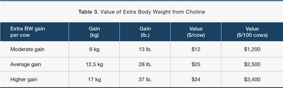 Rumen-protected choline (RPC) does not change body condition score (BCS), either before or after calving, which means cows are not gaining or losing visible condition from supplementation. However, overall body weight (BW) did increase, especially when cows received around 11 g/day, with an average gain of about 12.5 kg (≈27.5 lb.). This added weight is not from extra fat but reflects better nutrient use and more feed intake. In practical terms, cows maintained condition while carrying more body mass, a sign that RPC helps them cope with the transition period more efficiently (Table 3).